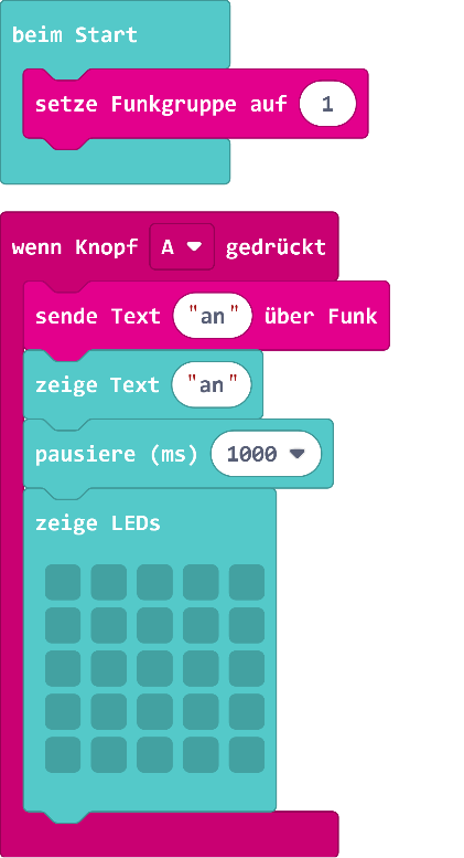 Der Fernbedienungs-Calliope ist der Sender. Wenn der Anwender die Taste A drückt, sendet der Calliope mithilfe des Blocks sende Text die Nachricht „an*"*. Damit man sieht, ob der Calliope auf den Tastendruck reagiert hat, wird hier zusätzlich eine Ausgabe auf der LED-Matrix erzeugt. Das hat für das Versenden der Nachricht aber keine Bedeutung.