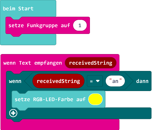 Der Lampen-Calliope ist der Empfänger. Mithilfe des Blocks wenn Text empfangen receivedString lauscht der Calliope, ob in seiner Funkgruppe Nachrichten eintreffen. Den Inhalt der Nachricht speichert er in der Variablen receivedString. Das bedeutet so viel wie empfangener Text. Den Block für die Variable receivedString kannst du einfach aus dem wenn Text empfangen-Block an eine andere Stelle im Programm ziehen, um eine Kopie des Blocks zu erhalten. Je nachdem, was in der Nachricht steht, kann der Lampen-Calliope nun reagieren. Wir prüfen, ob in der Variablen receivedString der Wert „an*"* steht. Wenn das der Fall ist, dann schalten wir die Lampe an. Verwende für den Vergleich den Block für den Vergleich von Texten. Du erkennst ihn an den Anführungszeichen in den weißen Feldern.