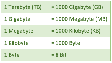 Im Zusammenhang mit den verschiedenen Speichermedien sind dir vermutlich Größenangaben wie Gigabyte oder sogar Terabyte begegnet. Die kleinste Speichereinheit ist ein Bit. Die nebenstehende Tabelle gibt dir einen Überblick, wie die Einheiten zur Angabe von Speicherkapazitäten zusammenhängen. Aufgabe 5